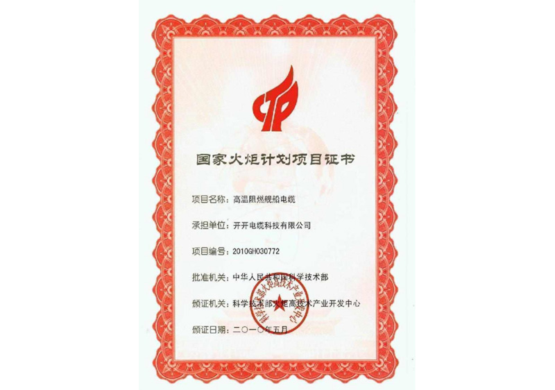 国家火炬计划项目证书