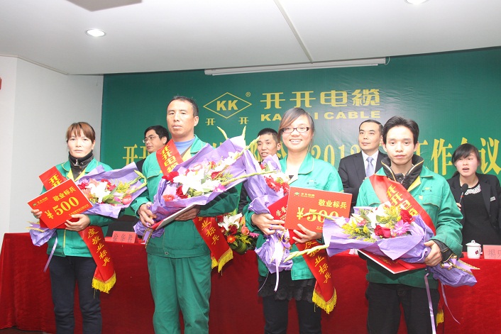 会议由总经理助理揭乐梅女士主持。揭助理首先主持了2011年度公司优秀员工、敬业标兵及先进集体的颁奖典礼。由公司领导颁发将金牌、荣誉证书及锦旗,并合影留念。先进员工代表占鹏及先进集体代表罗长付发表了获奖感言。