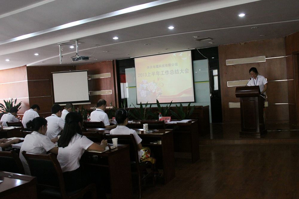 为了总结半年来取得的工作业绩和经验,查找存在的问题和盲点,吸取教训,明确调整方向,安排部署下半年的工作任务。2013年8月5日下午2:00,开开电缆科技有限公司2013年半年工作总结大会在椒江厂区三楼会议室顺利召开。本次大会由总经理助理丁婷婷主持。公司董事长余纪炎,总经理罗向阳,技术副总经理徐华胜,营销副总经理卢庆豪以及全体中层管理人员出席了本次会议。