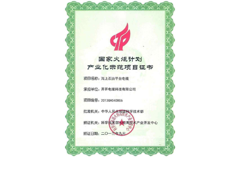 国家火炬计划产业化示范项目证书