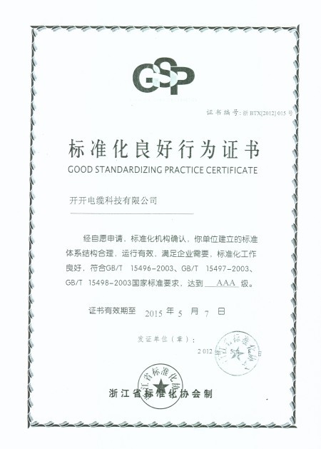 2012年5月7日,经浙江省标准化协会评定,我司的标准化体系被评为AAA级并被授予标准化良好行为
