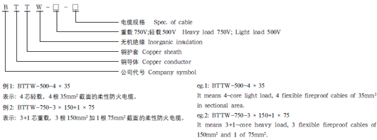 1、产品结构:1、导体为圆形铜绞线(相对BTT的实心铜杆较软),2、绝缘层为纯金云母带(不再与挤包绝缘料复合组成,从而排除碳粒的产生,提高了耐电稳定性),3、金属套为连续挤出的铝金属管(大大简化了BTT的铜管拉拔工艺),4、隔离套(交联绝缘)5、耐火层(在其外覆以火焰下不熔不燃可膨胀阻火的无机物—Mg(OH)或AL(OH)),6、外护套塑料(聚烯烃或聚氯乙烯),用铝为主要材料金属管挤出代替铜管拉拔不但简化了工艺提高了效率,而且使产品成本大幅下降(铝材仅为铜材综合成本的1/10)。用铝管之所以能代替铜管,在高温火焰下不熔,得益于铝管外挤覆的膨胀耐火层:在火焰侵袭下膨胀层发泡固化,形成厚厚的屏障阻隔了火焰对铝管的直接喷射。不但铝管的完整性得以保存,而且使云母带受热温度降低至600℃以下,云母带绝缘的稳定性无疑得到提高(云母带的绝缘电阻随温度的降低而上升)。