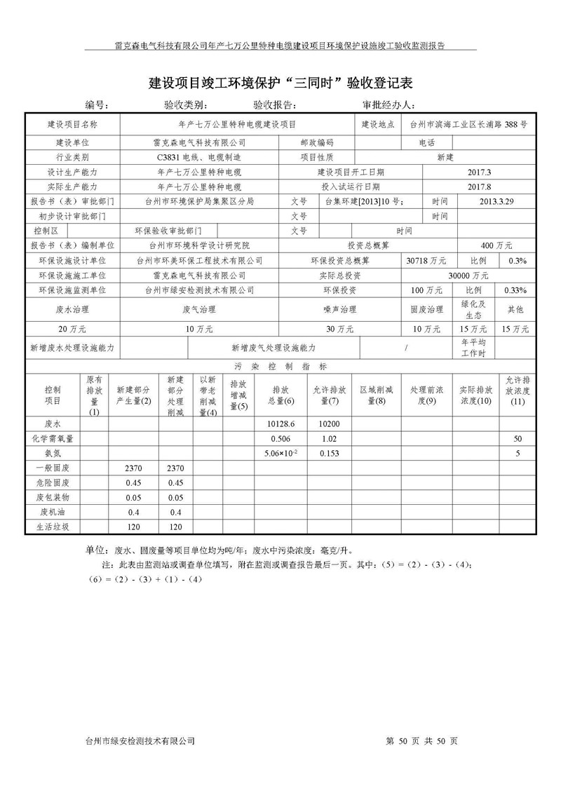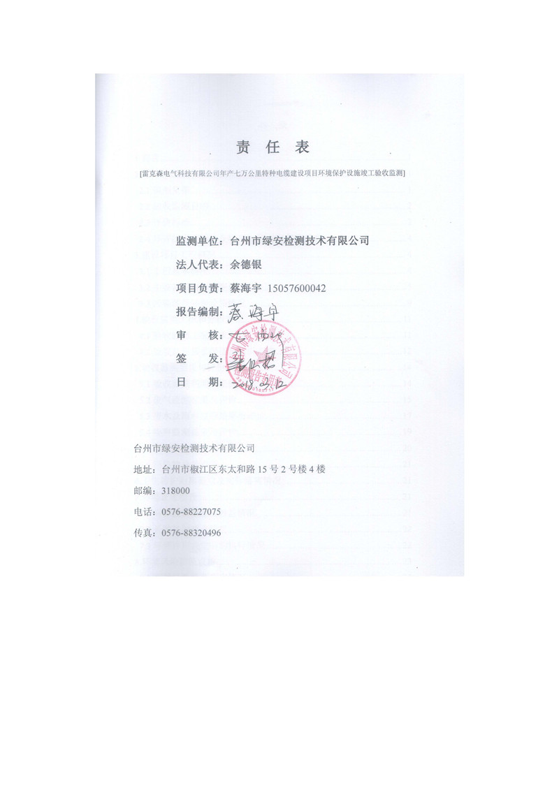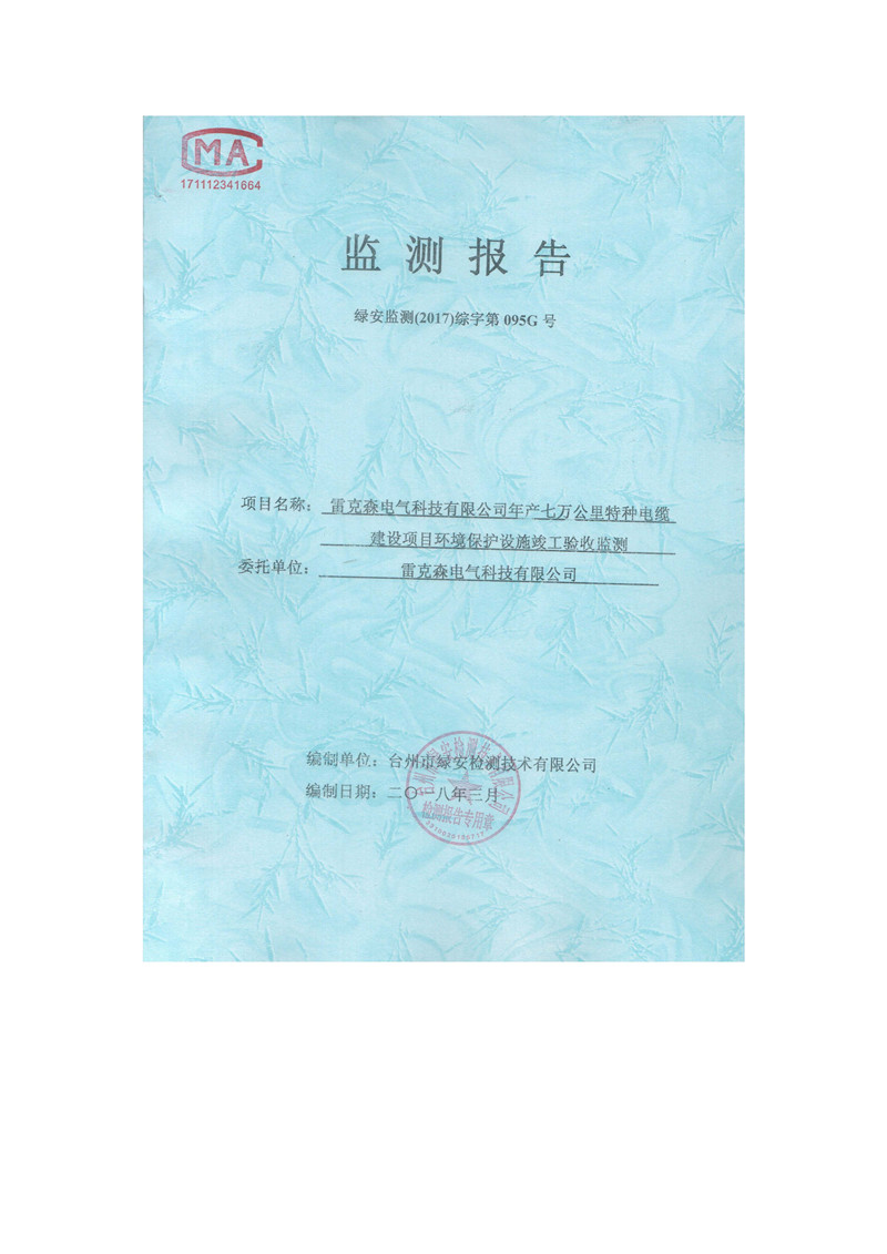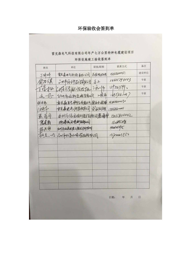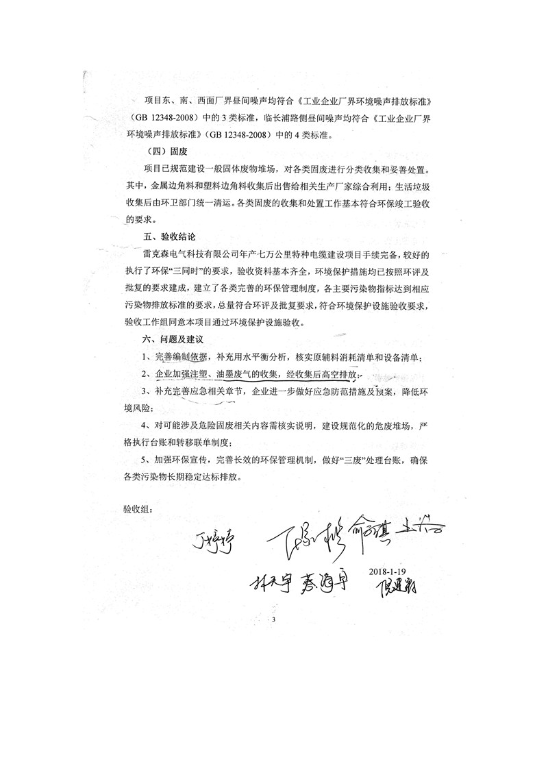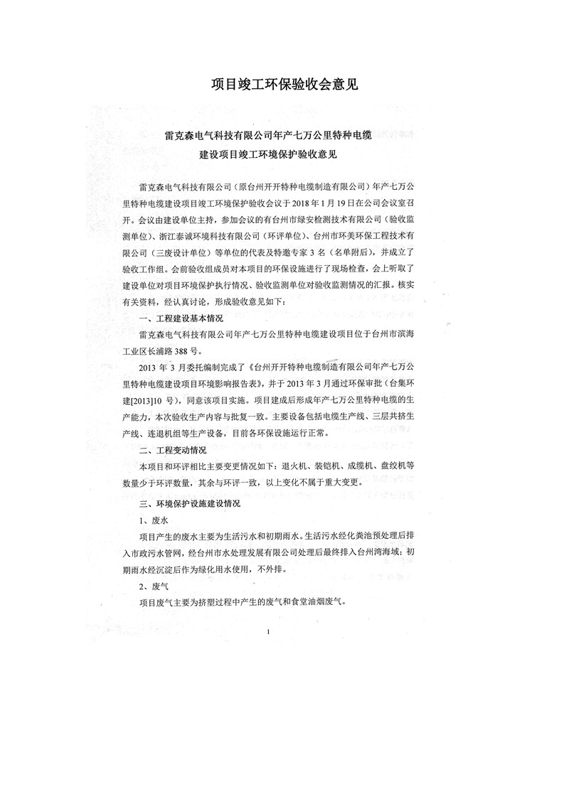 雷克森电气科技有限公司年产七万公里特种电缆建设项目环境保护设施竣工验收监测报告及验收意见公示。