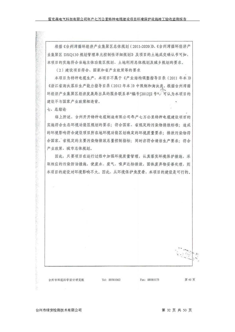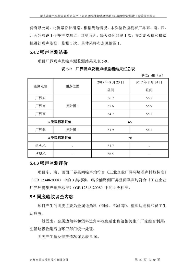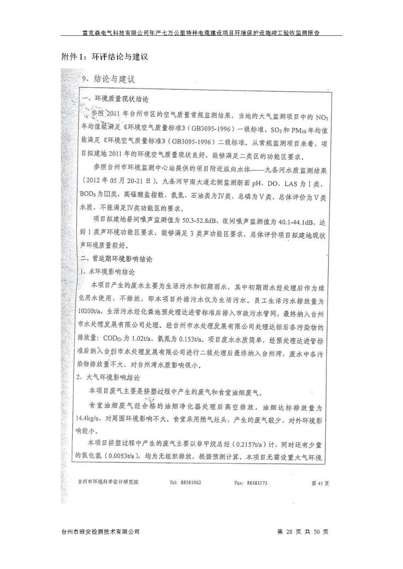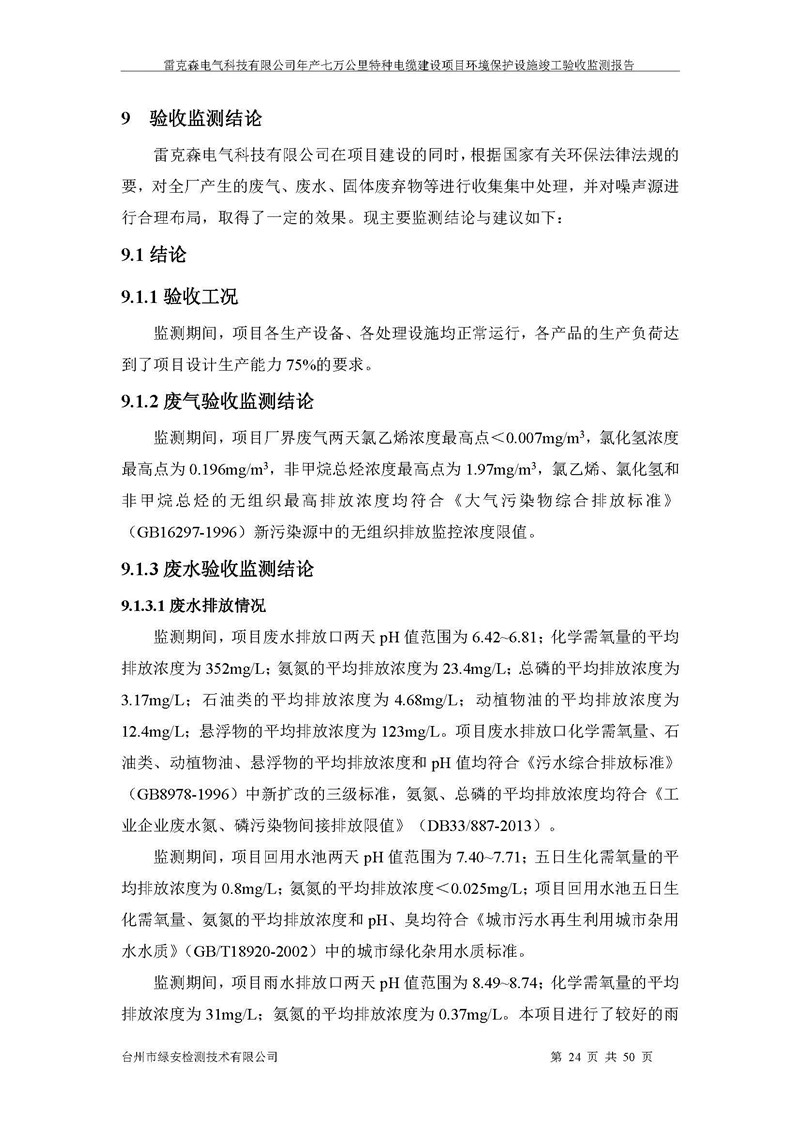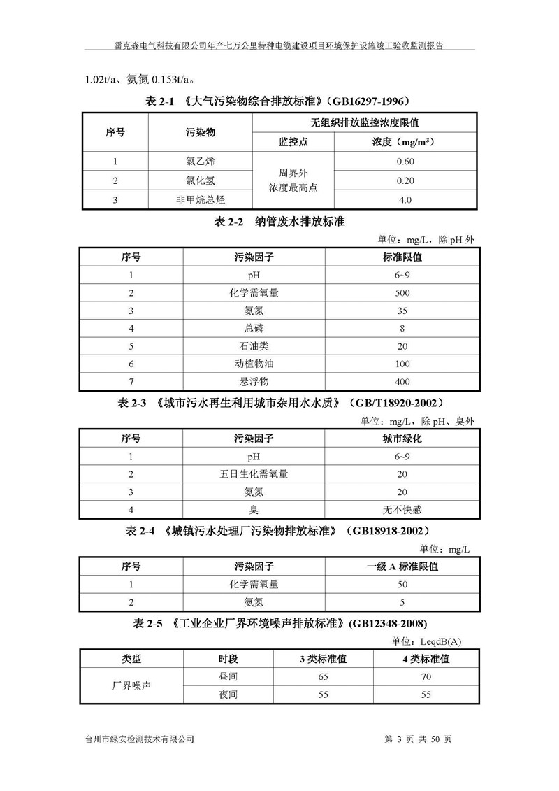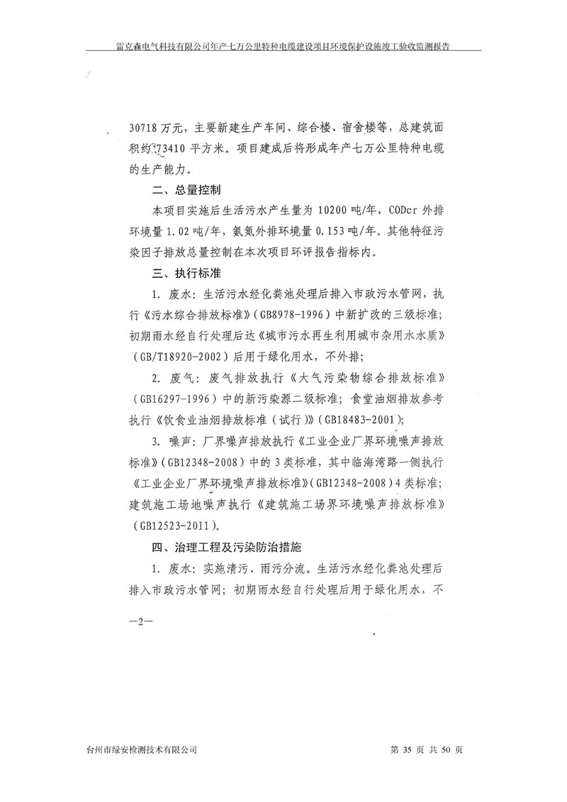 雷克森电气科技有限公司年产七万公里特种电缆建设项目环境保护设施竣工验收监测报告及验收意见公示。