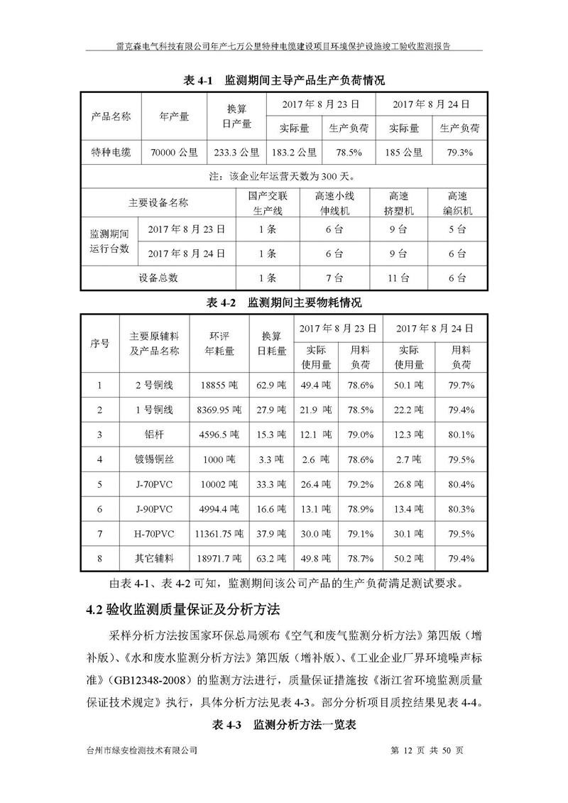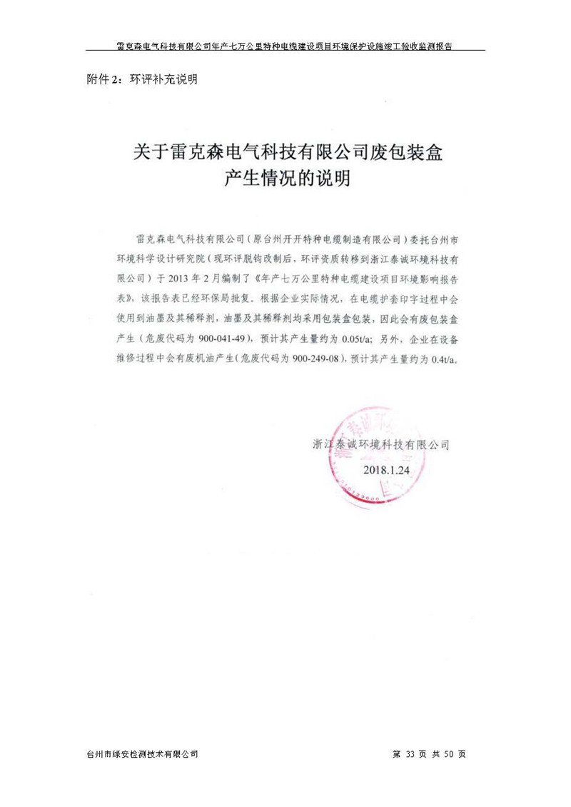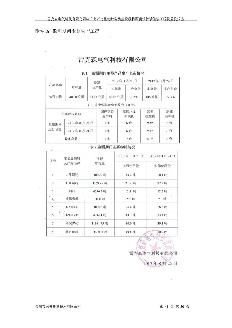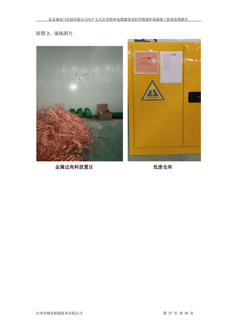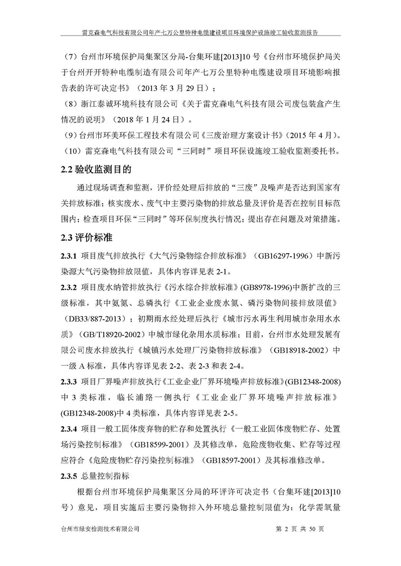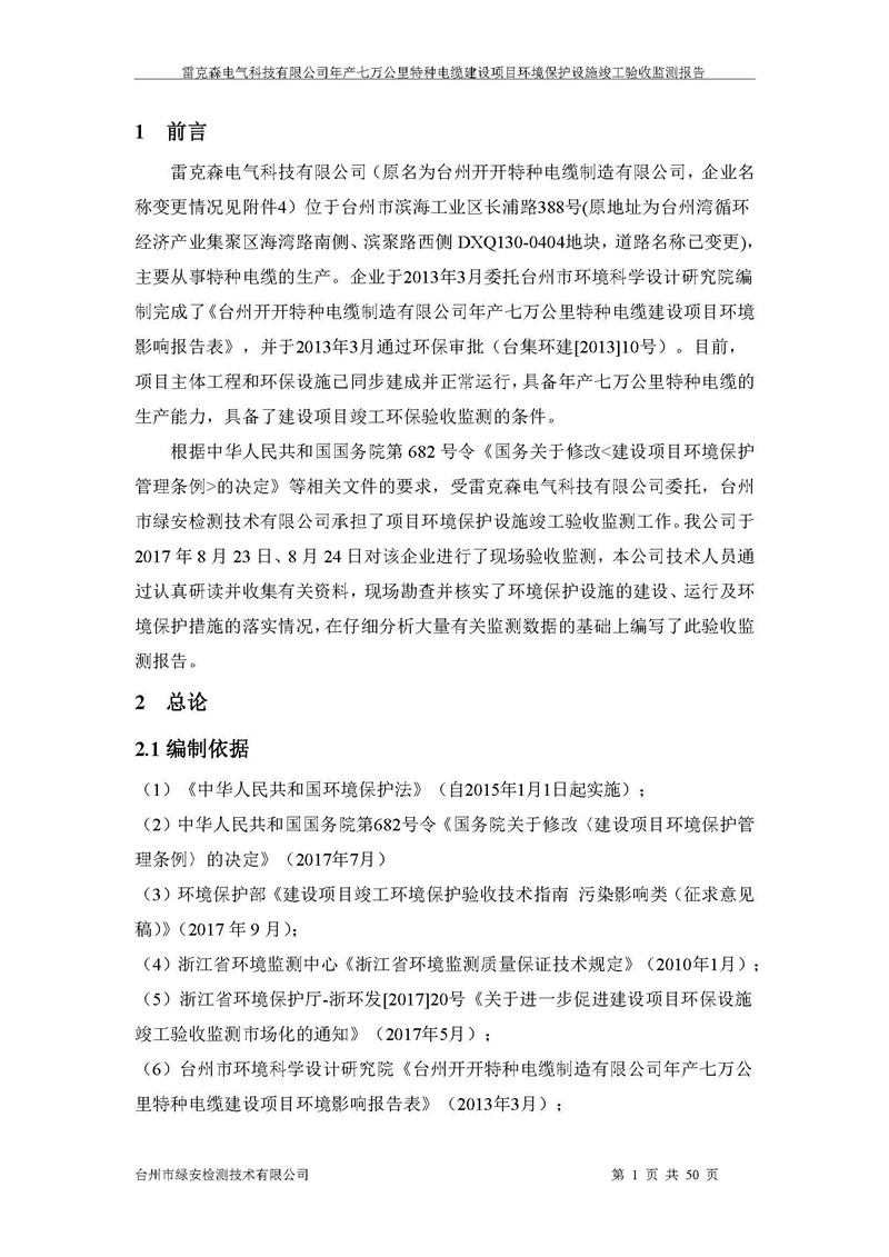 雷克森电气科技有限公司年产七万公里特种电缆建设项目环境保护设施竣工验收监测报告及验收意见公示。