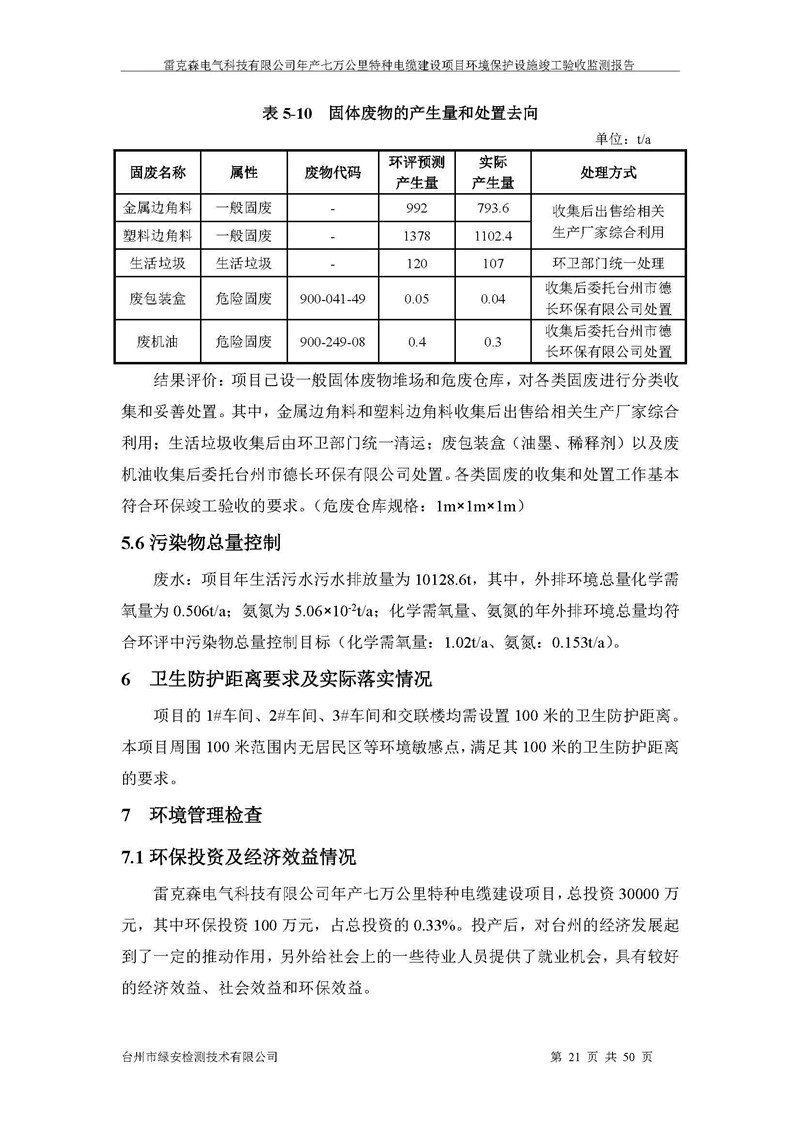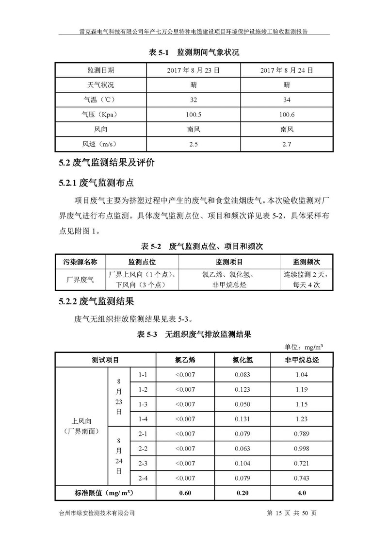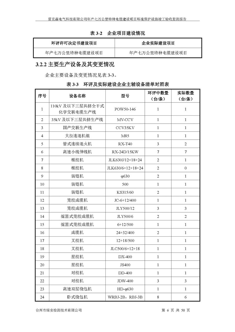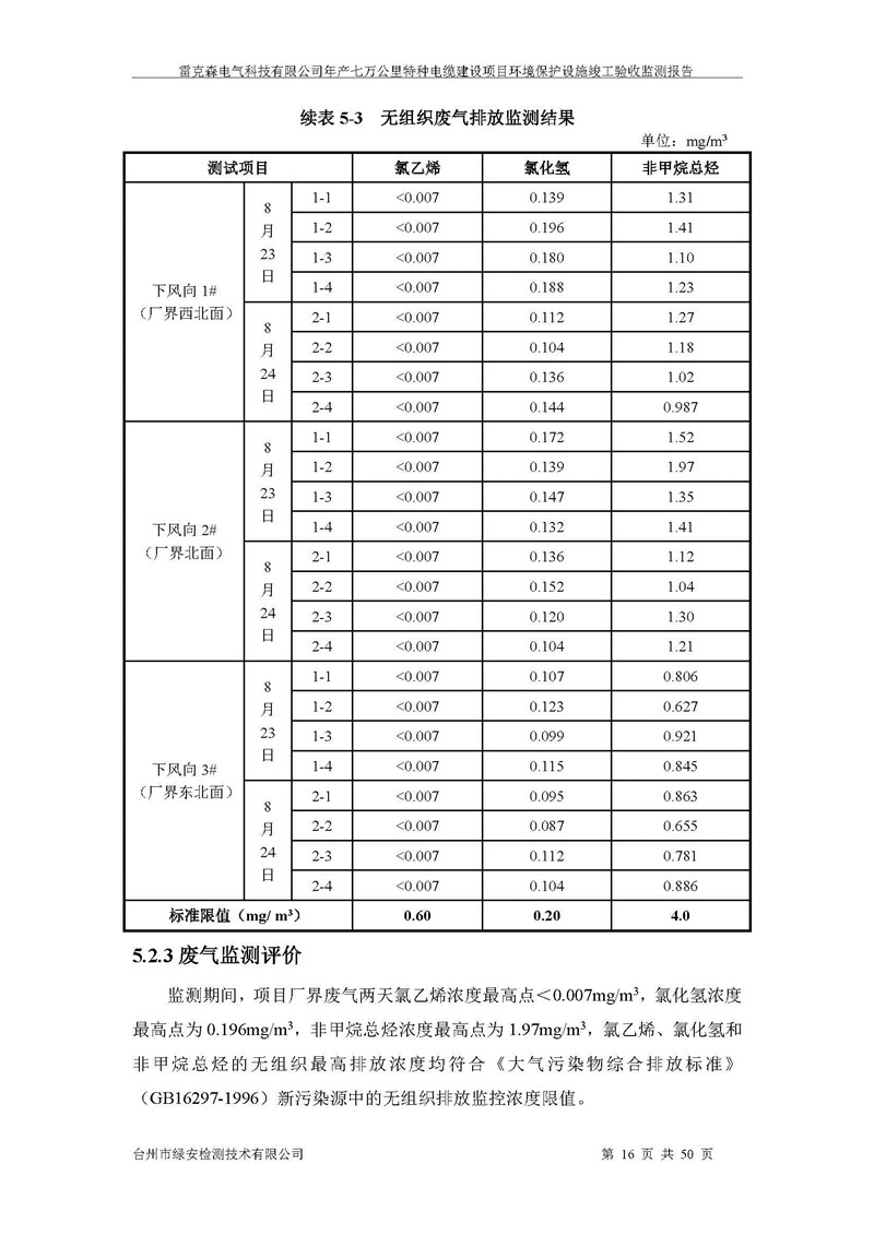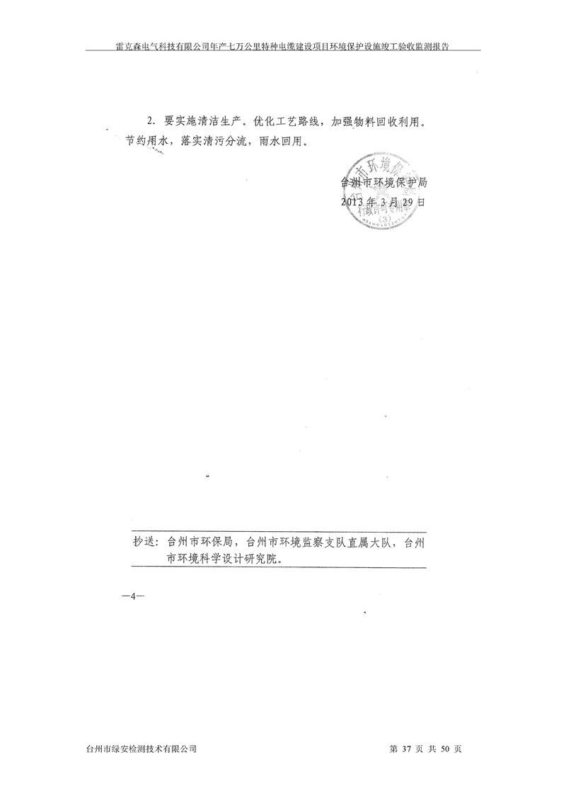 雷克森电气科技有限公司年产七万公里特种电缆建设项目环境保护设施竣工验收监测报告及验收意见公示。