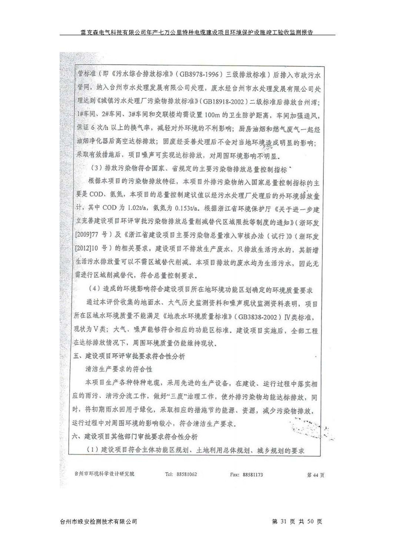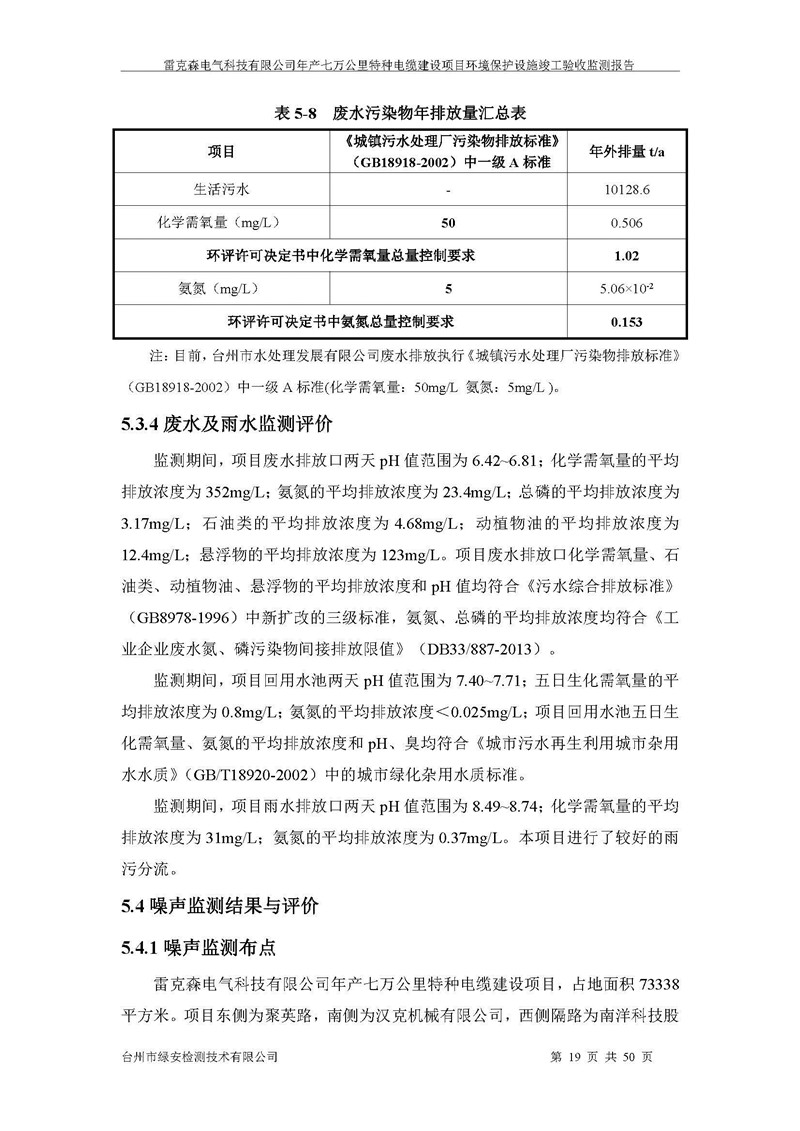 雷克森电气科技有限公司年产七万公里特种电缆建设项目环境保护设施竣工验收监测报告及验收意见公示